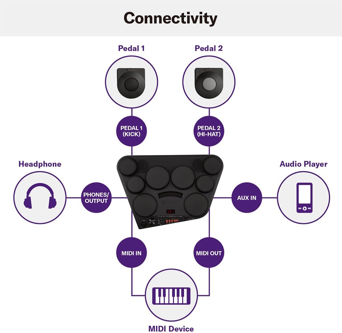 - Two assignable foot pedals included for kick, hi-hat or any other voice