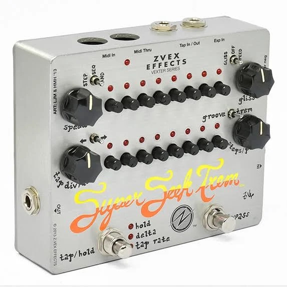 This is a far more advanced version of the original Seek Trem and Tremorama pedals. Basically the Super Seek Trem is a 16 step sequencer of volume pots. This allows you to do tremolo in complex rhythmic patterns impossible with standard tremolos. From automated volume swells, to ex- treme helicopter blade like square wave tremolo that gallops, to what sounds like traditional amp tremolo but is pulsing in a nine step pattern of triplets against your 4/4 groove... all locked to your Pro Tools Session! Polyrhythmic bliss! New features include: tap tempo, MIDI tempo control, glissando, expression pedal control over tempo and glissando, adjust- able number of stages from 1 to 16, automatic tempo slow- ing or speeding (delta), savable/loadable presets and more!
