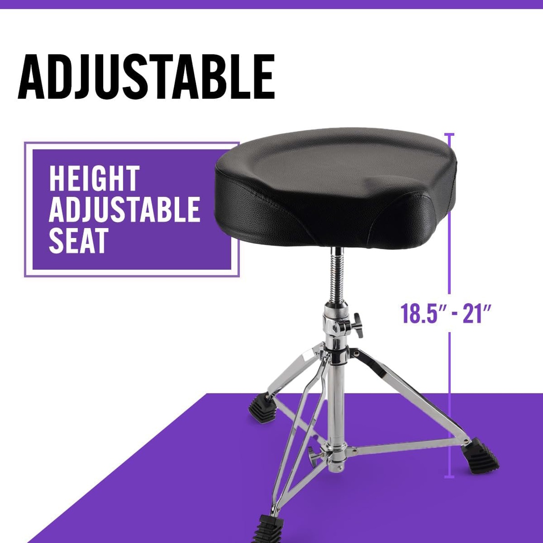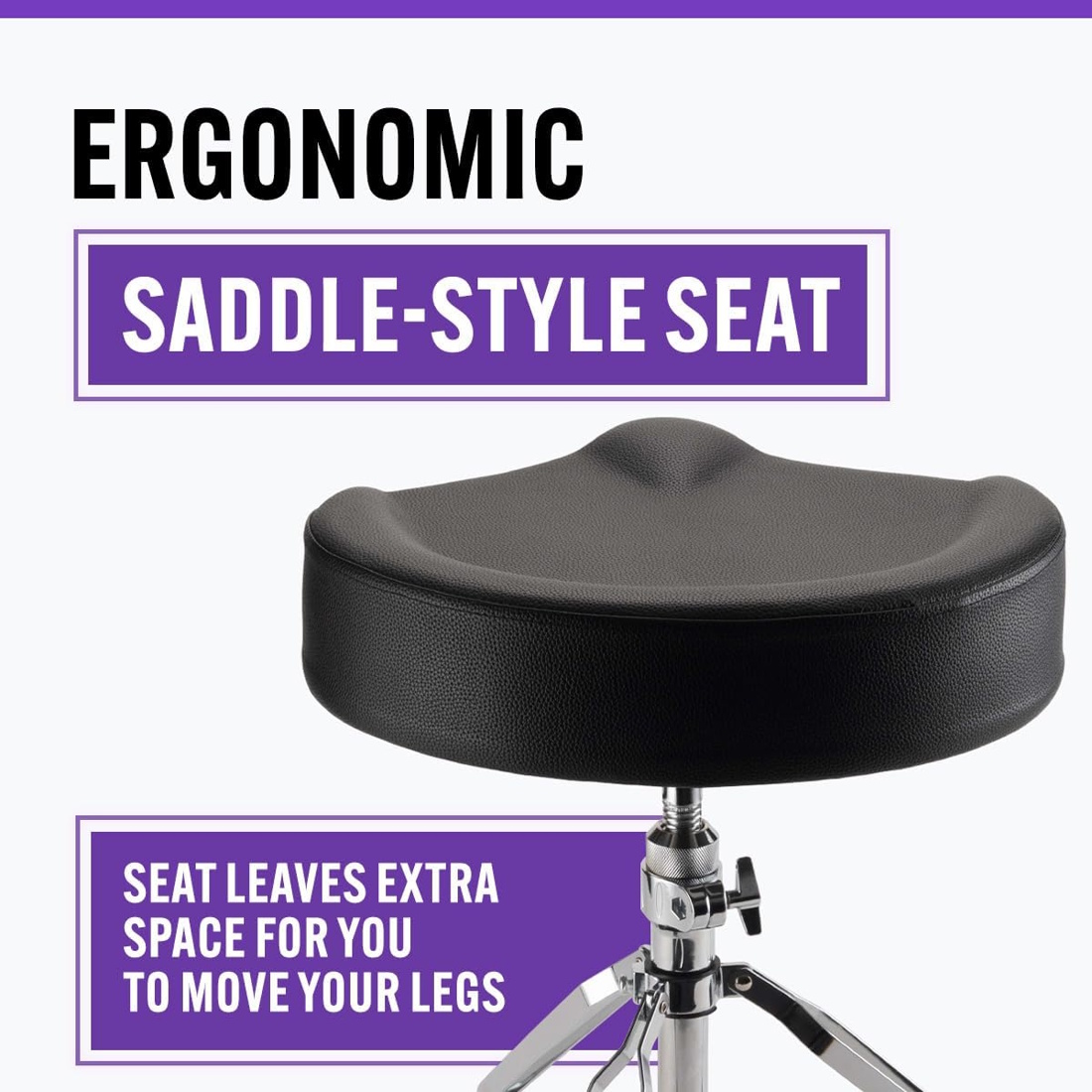 Keep comfortable while keeping the beat with the MDT4 Heavy-Duty Drum Throne. Springy yet firm, the cushioned seat absorbs pressure on your body and evenly distributes your weight to minimize fatigue while you play. Its saddle-style contour leaves extra space in front of the throne, enabling a wide range of motion for your legs, making it easier to operate foot pedals. And a raised ridge around the back and sides helps you stay centered and maintain good posture during live performances, recording sessions, and practices. The height adjusts according to your playing preferences, ensuring a balanced combination of pedal control and stick reach on a wide range of drum kits. With its swivel-type adjustment mechanism, there are no preset height settings, allowing you to precisely dial in your ideal playing position. Your settings lock in place with a tightening knob for consistent performance and ease of setup. The rugged metal base features three braced legs delivering outstanding strength and weight support. Rubber feet with treads and shock absorption prevent drifting and sliding to keep the throne right where you want it. And its 18.9-inch footprint forms a solid foundation, giving you reliable balance and stability. Finished in chrome on the base and black leatherette on the seat, this throne blends into your livestream, stage, or studio drum setup for a professional presentation. The seat is removable and the tripod base quickly folds down for ease of load in, setup, teardown, and load out while also enabling compact storage and efficient transportation.